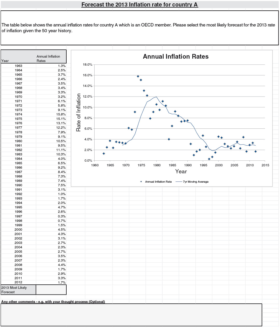 (Q4): Inflation is an economic factor on which our respondents had much to say. A range of economic and political points were made, from quantitative easing to the effectiveness of political institutions in OECD countries to control inflation. Around 41% of respondents made use of such information. Nevertheless, around 46% focused only on graphical features (the remaining 13% did not explicitly comment either way). The two groups gave very similar answers on average.