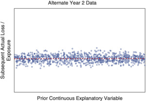 Note that in a real-world application of a predictive framework, the performance of the regression line from the first year to predict the second year would be tested. If it performed well, then the regression line for the second year would be used to forecast a third year. So predictive performance testing would result in utilizing the regression line in the first case but discarding it in the alternative case. The real-world loss process would most likely lead to the third year resembling the second year in the first situation, but having a different slope from that of the second year in the alternative situation. Consequently, predictive performance testing would work well by obtaining predictive value when it is available but avoiding the pitfall of a poor prediction.