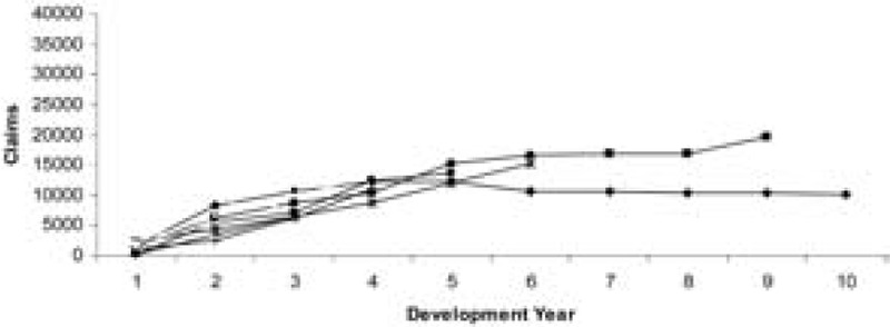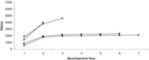 Example 2. In this section, a set of aggregate data from Lloyd’s syndicates is considered. In this case, the data are not as stable or well behaved and the results are quite different. Tables 6 and 7 show the data, which are plotted in Figures 4 and 5. It can be seen from these figures that the data are much more unstable and more spread out compared with the previous two examples.