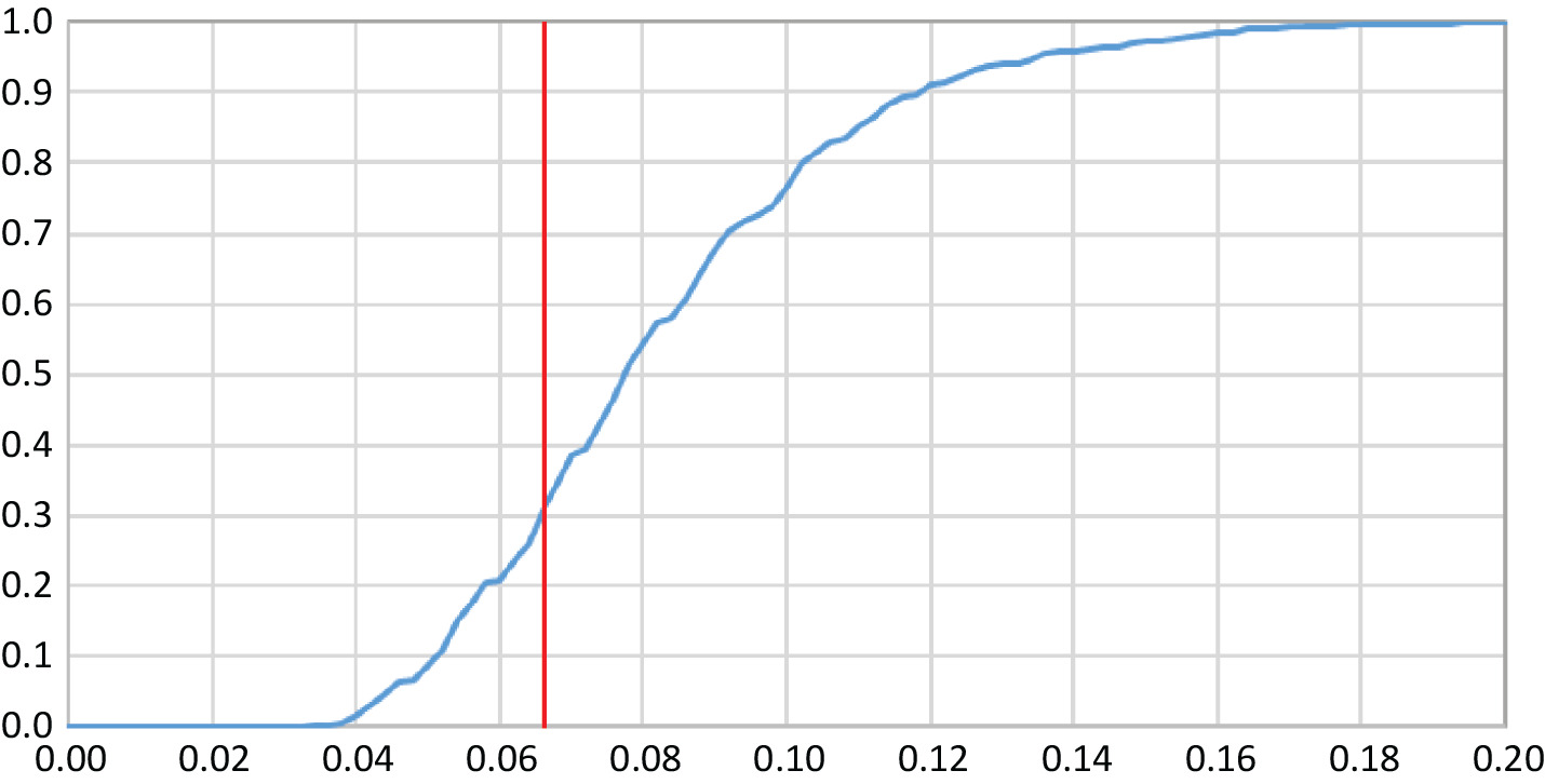 The maximum absolute difference between the empirical and the fitted, |max| = 0.066, occurs at x = 0.1. We tested its significance with a “KS-like” (Kolmogorov-Smirnov, cf. Hogg and Klugman [1984, p. 104]) statistic. We simulated 1,000 samples of 85 instances from the fitted distribution, i.e., from the Y distribution with its four estimated parameters. Each simulation provided an empirical cumulative distribution, whose maximum absolute deviation we derived from the fitted distribution over the interval [−4, 4] in steps of 0.1. Figure 4 contains the graph of the cumulative density function of |max|.