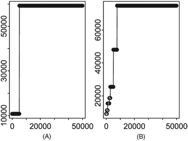 The curve of the predicted value resulting from a tree fit to total paid losses is a step function. As shown in Figure 2A, with only two terminal nodes, the fitted function is flat until $4,043, steps up to a higher value, and then remains flat. Figure 2B displays the predicted values of a tree with seven terminal nodes. The steps or increases are more gradual for this function.