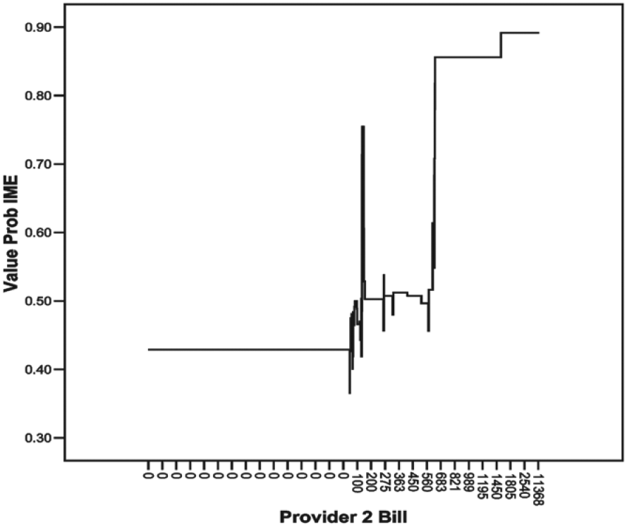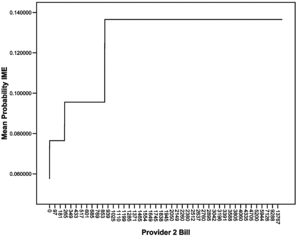 The method is described in more detail in Kantardzic (2003). To illustrate the use of naïve Bayes in predicting discrete variables, the provider 2 bill data was binned into groups based on the quintiles of the distribution. Because about 50 percent of the claims have a value of zero for provider 2 bills, only four categories are created by the binning procedure. The new variable was used to estimate the IME targets. Figure 6 displays a bar plot of the predicted probability of an IME for each of the groups. Figure 7 displays the fitted function. This function is a step function which changes value at each boundary of a provider 2 bill bin.
