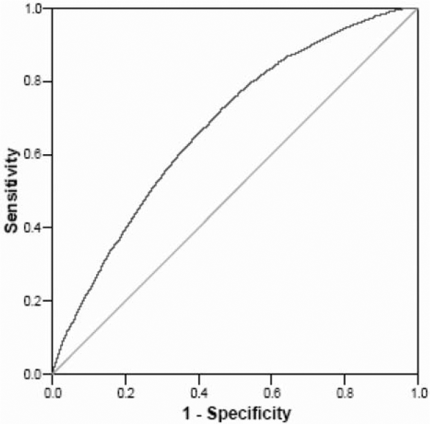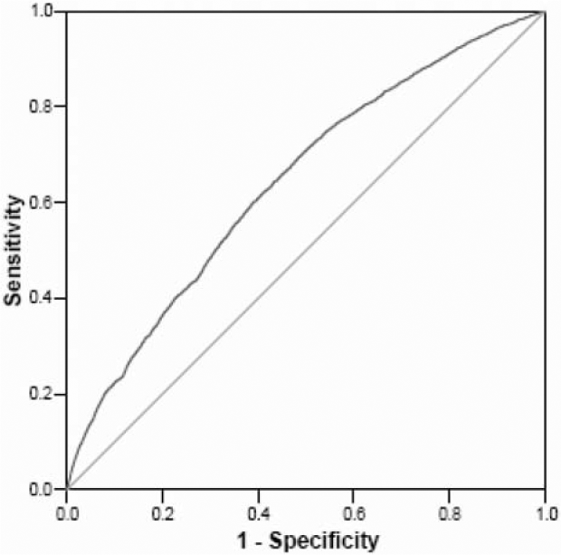 A statistic that provides a one-dimensional summary of the predictive accuracy of a model as measured by an ROC curve is the area under the ROC curve (AUROC). In general, AUROC values can distinguish good models from bad models but may not be able to distinguish among good models (Marzban 2004). A curve that rises quickly has more area under the ROC curve. A model with an area of 0.50 demonstrates no predictive ability, while a model with an area of 1.0 is a perfect predictor (on the sample the test is performed on). For this analysis, SPSS was used to produce the ROC curves and area under the ROC curves. SPSS generates cutoff values midway between each unique score in the data and uses the trapezoidal rule to compute the AUROC. A nonparametric method was used to compute the standard error of the AUROC.[42]