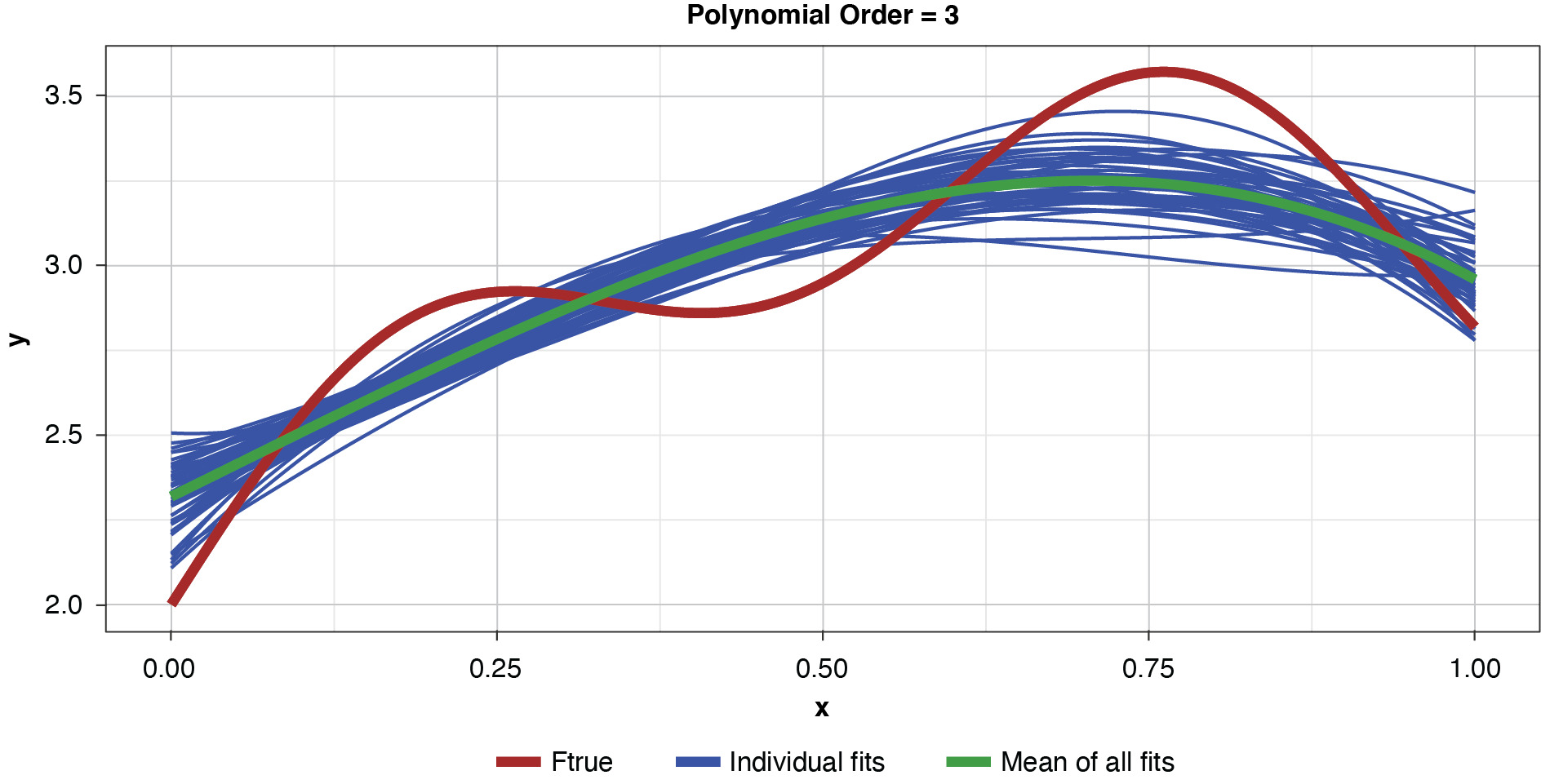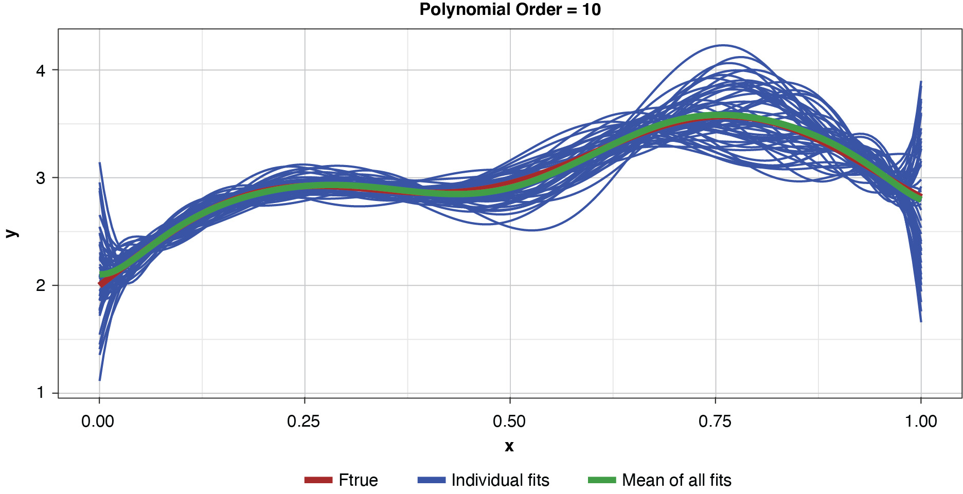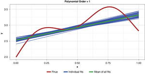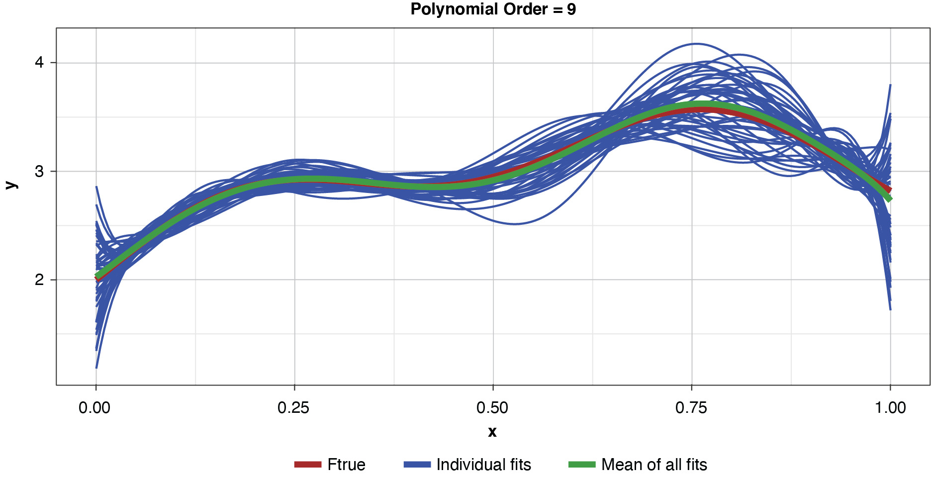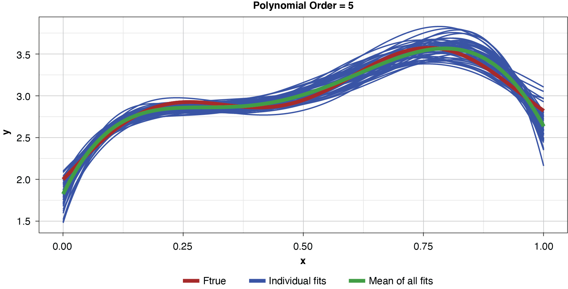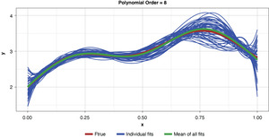 Figure 5 demonstrates the 50 simulated instances of the simplest polynomial model with 50 thin blue lines. The thicker green line in the middle of the cluster of the 50 instances is the mean of the 50 fits, providing an estimate of the expected value of the estimator, or 𝔼[g(x)]. While this simplest of models has high bias for most x values, the tight clustering of the individual fits demonstrates the model’s low variance.