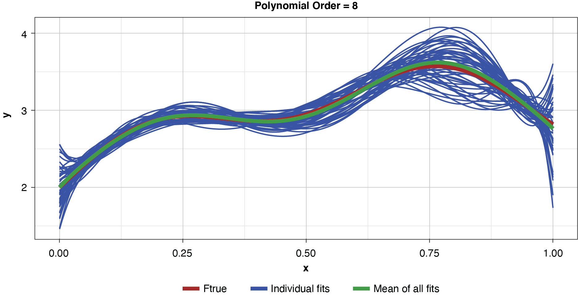 As noted previously, and as shown in Figure 6, if the model’s complexity is increased slightly (to a power of two), the bias is lessened somewhat compared to the simplest model. However, the individual fits are not as tightly clustered as in Figure 5, demonstrating the higher variance of the more complex estimator.