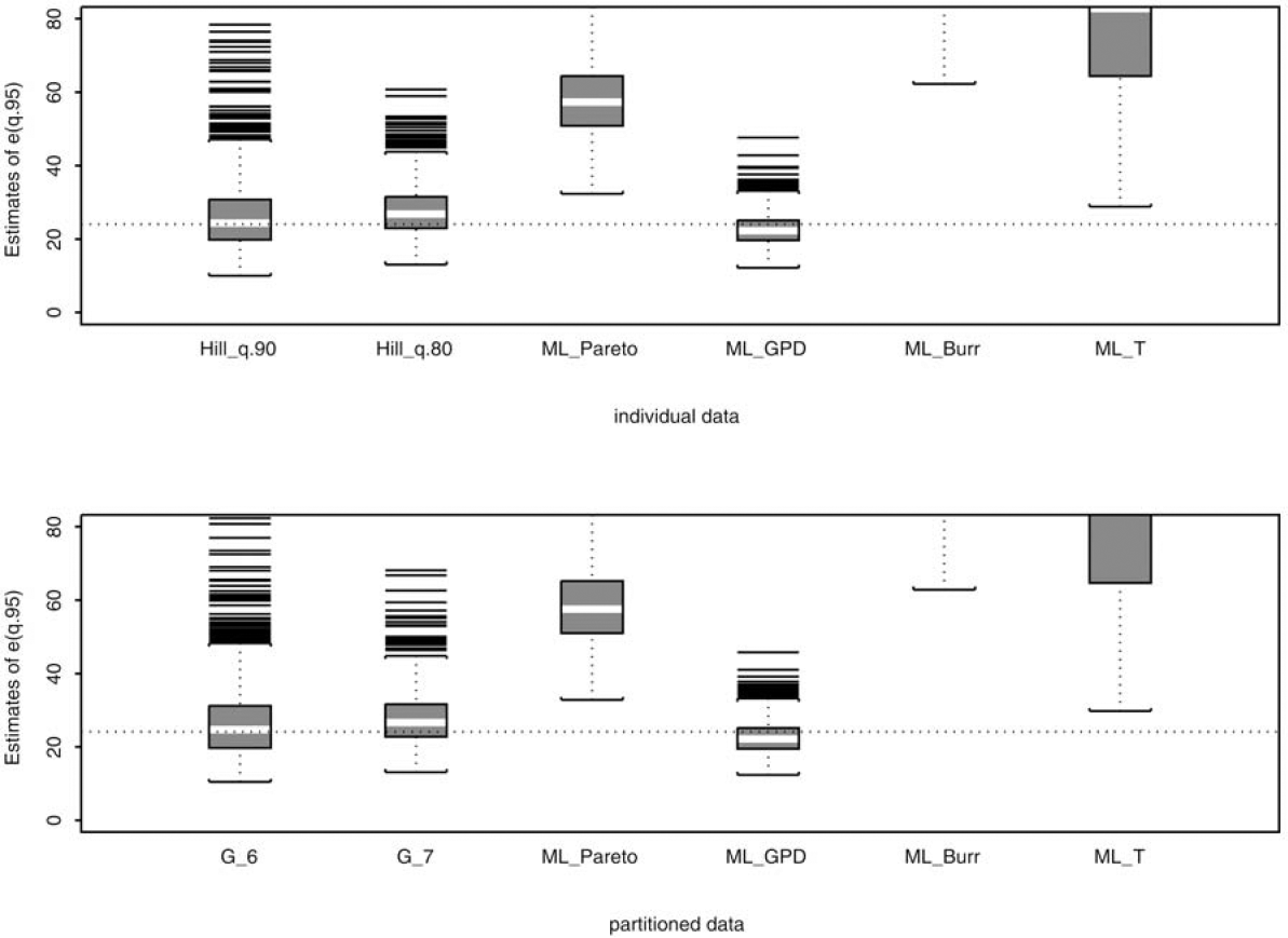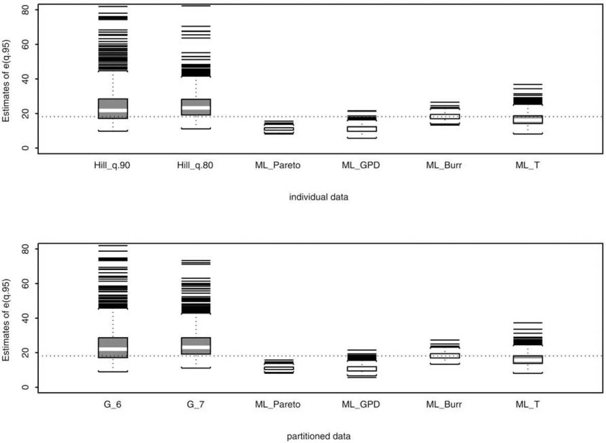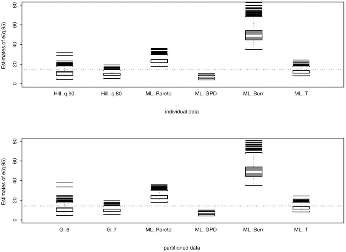 using frequencies in the intervals where to that of the Hill estimator using all as well as to that of the maximum likelihood estimator using all frequencies or all In Figures 1-4, we report the loss in efficiency due to the use of partitioned data. The Hill estimates for in the th box-plot, from left to right, are calculated using the largest order statistics. The estimates from the proposed estimator in the th box-plot, from left to right, are calculated using Eq. (3.2) with for We notice that in Figures 1-4 the proposed estimator behaves similar to the Hill estimator. In addition, we take the tail estimates that comprise each box-plot to calculate the root mean squared error (RMSE). That is, for the th box-plot, where the true tail index and represents the th tailindex estimate in the th box-plot. The dashed line in each panel represents the true tail-index parameter value. To quantify the loss of efficiency, we further define efficiency (EFF) as the ratio of obtained from the proposed estimator to obtained from the Hill estimator. The results are reported inTo examine the robustness of the proposed estimator against model misspecification, we compare the proposed estimator using frequencies in the top 6 and 7 intervals, which correspond to the 90th and 80th percentiles of the true underlying distribution, to four maximum likelihood (ML) estimators using all 15 frequencies N1, . . . ,N15. These four ML estimators differ in the assumed underlying distributions. They include Pareto (ML Pareto), generalized Pareto (ML GPD), Burr (ML Burr), and half T (ML T). Following our simulation design, it allows one of the four ML estimates to be the target estimate since this particular estimate is obtained by assuming the correct underlying distribution and by using the entire sample (all 15 frequencies) in estimation. The performance of the Hill estimator using observations above the 90th and 80th percentiles of the true distribution is also compared to those of the four similarly defined ML estimators that use the entire sample in estimation. With the tail estimates, we then calculate the expected loss exceeding the 95th percentile of the true distribution, e(q.95) = E{X − q.95 | X > q.95}. The resulting expected losses are reported in Figures 5–8. In addition, we quantify these figures by calculating RMSE and EFF (see Table 3). Note that EFF in this table is defined as the ratio of RMSE of an estimator to that of the ML estimator that assumes the correct underlying distribution. Hence, if the true underlying distribution is Pareto, then EFF = 1 for ML_Pareto.