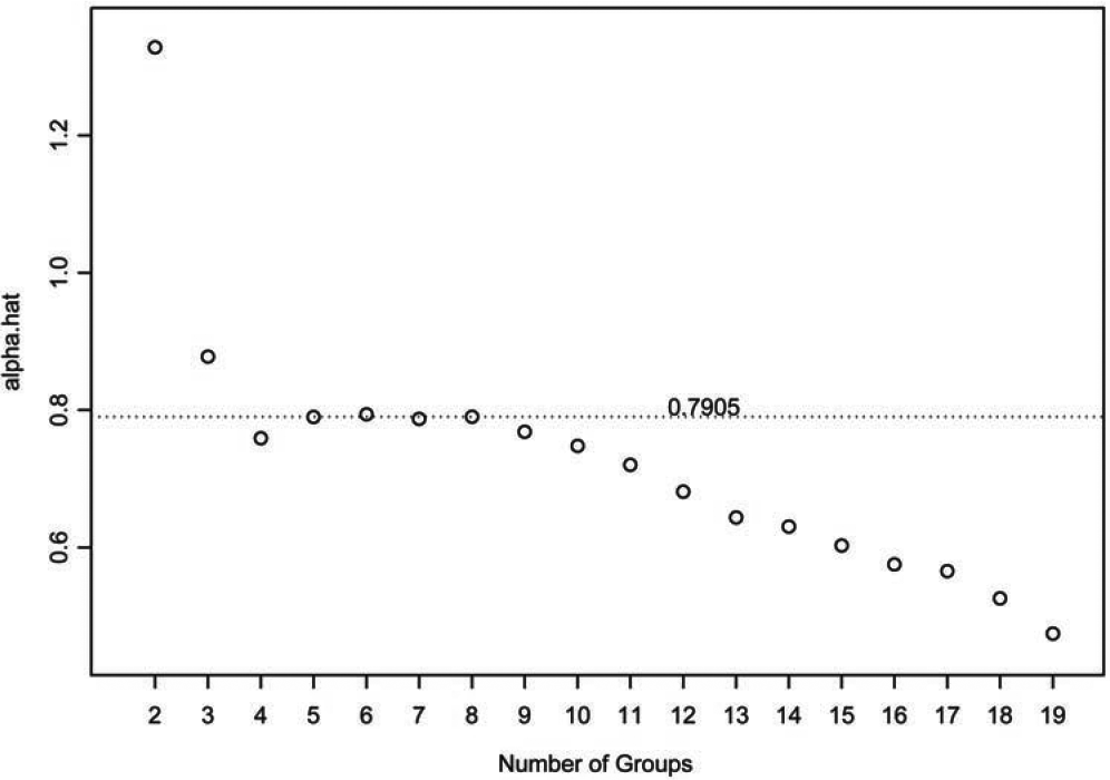 To determine the threshold above which to fit the Pareto tail and estimate the tail index, we look for a range in which the α estimates are stable. We use a plot similar to the Hill plot (see, for example, Embrechts, Klüppelberg, and Mikosch (1997) and Drees, de Haan, and Resnick (2000)), but modify it to be applicable for partitioned losses. Under our general framework, we consider the plot