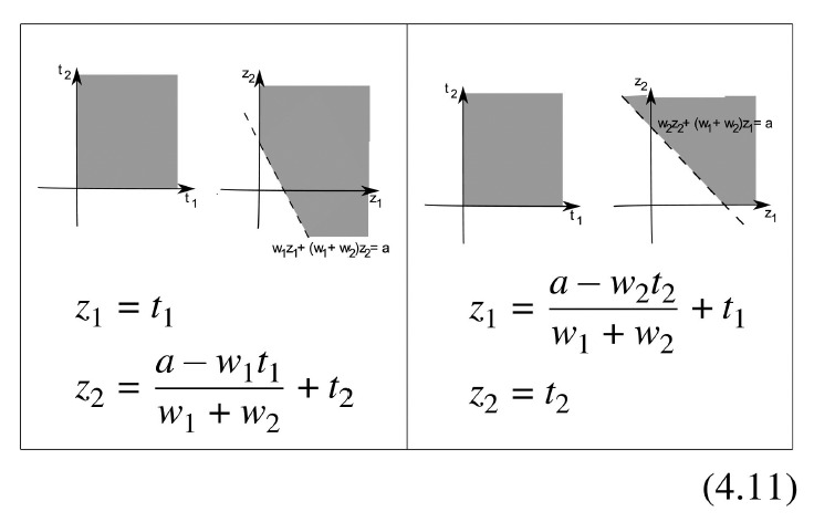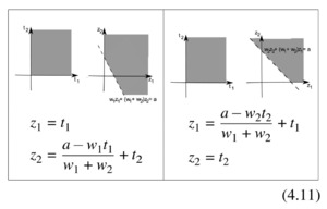 \[ \begin{array}{rlll} p\left(z_{1}+z_{2}, z_{2}\right)+y_{0} z_{1} \geq 1, & \text { for all } \quad z_{1}, z_{2} \quad \text {with} \quad w_1\left(z_1+z_2\right)+w_2 z_2 \leq a, z_1 \geq 0\\ p\left(z_{1}, z_{1}+z_{2}\right) & \text { for all } \quad z_{1}, z_{2} \quad \text{with} \quad w_1 z_1+w_2\left(z_1+z_2\right) \leq a, z_2 \geq 0 \\ p\left(z_{1}+z_{2}, z_{2}\right)+y_{0} z_{1} \geq 0, & \text { for all } \quad z_{1}, z_{2} \quad \text {with} \quad z_1 \geq 0\\ p\left(z_1, z_1+z_2\right) \geq 0 & \text { for all } \quad z_{1}, z_{2} \quad \text {with} \quad z_2 \geq 0. \end{array} \tag{4.7} \]