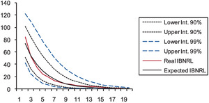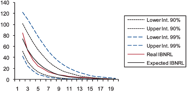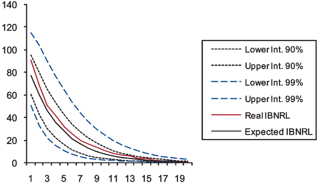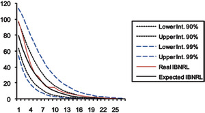 As Figures 1, 2, and 3 show, the prediction intervals are not symmetrical with respect to the expected IBNRL, since data have been exponentially transformed. For either case (namely, 90 and 99 percent intervals), both the real and the expected data remain within the calculated prediction limits. This is a good fit for the IBNRL normal distribution, which demonstrates that our modeling accurately captures the uneven behavior of the claim reporting process over time.