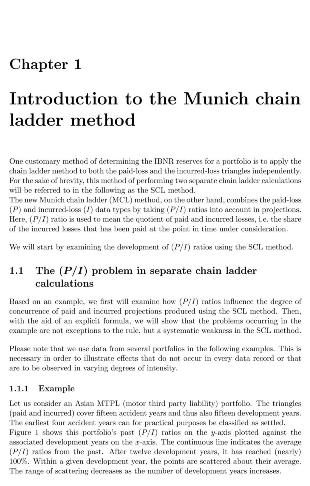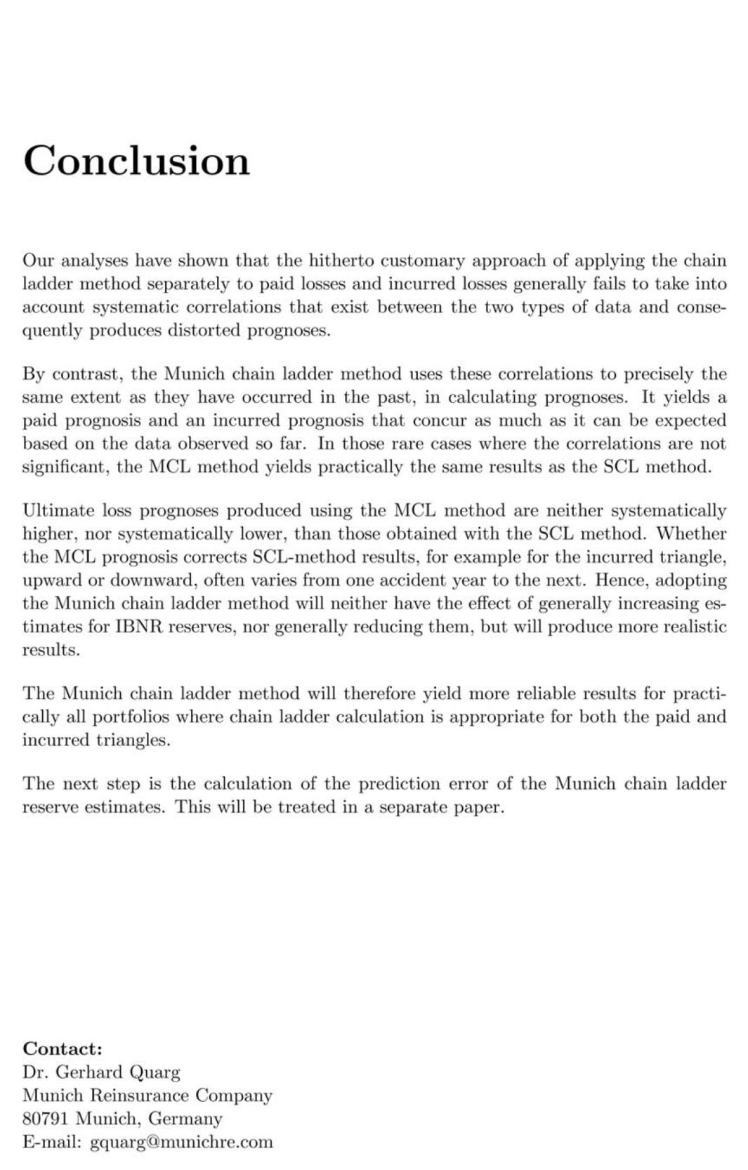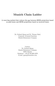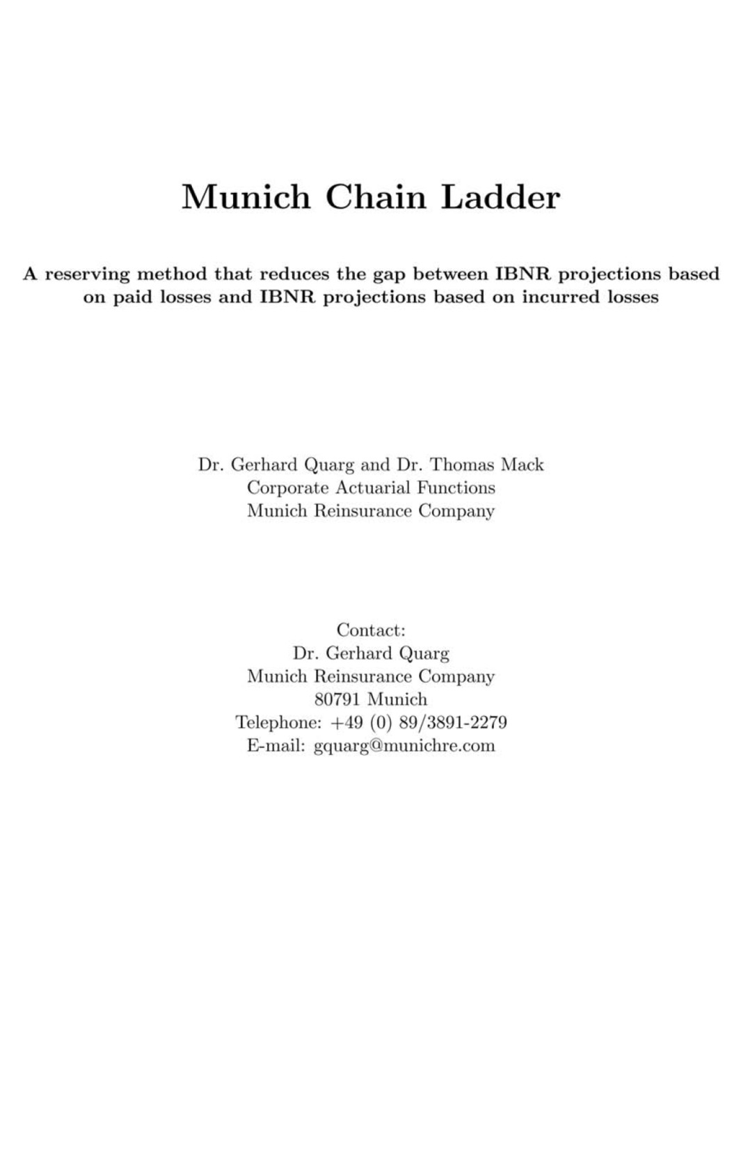 “Munich Chain Ladder” by Dr. Quarg and Dr. Mack is being reprinted in Variance to give this important paper wider visibility within the actuarial community. The editors of Variance invited the authors to submit their paper for republication because we believe that the techniques described in their work should be known to all actuaries doing reserve analysis. We also hope to stimulate further research in this area. This paper is reprinted from Blätter der Deutschen Gesellschaft für Versicherungsund Finanzmathematik, volume 26, number 4, 2004, pages 597–630. We thank the editors of that journal and the authors for allowing Variance to publish the paper.