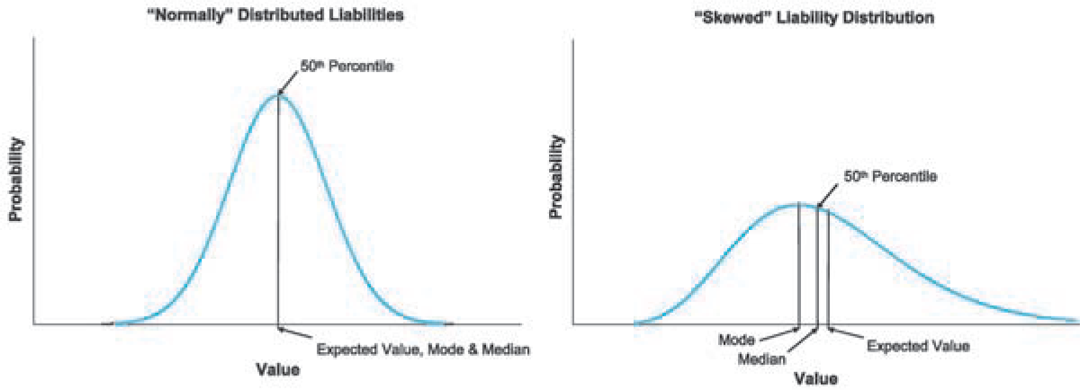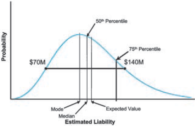 Using a probability range will also add context to other statistical measures. For example, as most liability distributions are skewed to the right, the mean will usually represent a value that is greater than the 50th percentile and can be used to help illustrate how the potential for the actual outcome to be worse than expected is greater than the potential to come in better than expected. Some actuaries have argued that the mode or the median could also be considered when describing what is “reasonable” in this context but, like the mean, discussing these as part of a probability range will complete and tie these various measures together.
