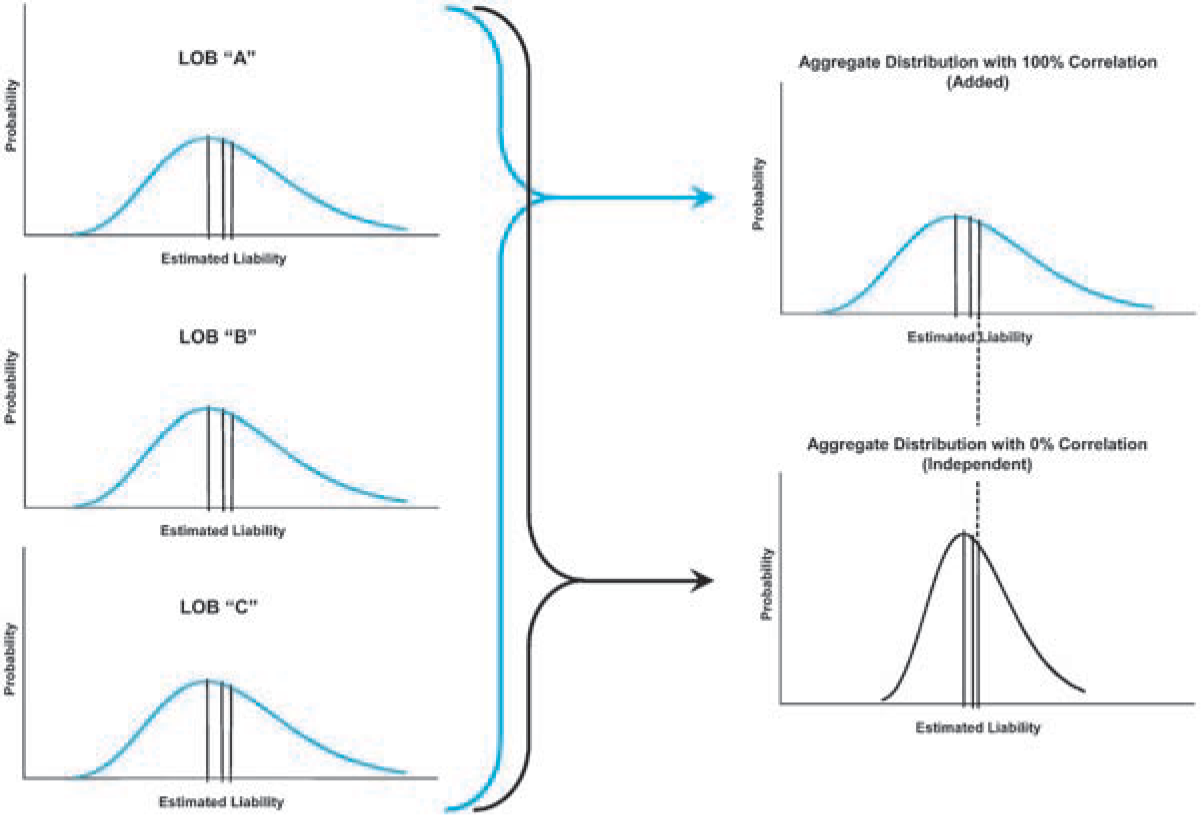 When reserves are selected by line of business and then simply added together to arrive at the total for all lines of business combined, this process is the same as assuming 100% correlation between lines. Generally, there is some level of independence between lines (i.e., less than 100% correlation), which means that the total of selected individual medians (or modes) will be less than the median (or mode) of the aggregate for all lines combined. This concept is illustrated in Figure 2. Thus, if the median (or mode) is considered to be a “reasonable” low end for a probability range, then the medians (or modes) for the individual lines of business will need to be adjusted so they sum to the median (or mode) for the aggregate of all lines.[17] Using the expected value as the low end of the “reasonable” probability range will avoid this problem.[18]