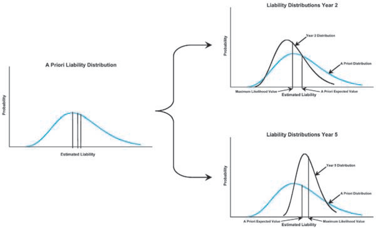 Prior to the incidence of a cohort of claims, their distribution and expected value can be estimated (the a priori distribution). Once the claims have occurred and the settlement process begins, the new estimates of their ultimate value will gradually become more certain over time until all claims are completely settled and their value is known with 100% certainty. As an example illustrated here, in year 2 the claims paid to date are less than anticipated in the first two years and, therefore, the remaining expected value plus the current paid to date results in a new distribution with a total expected value (maximum likelihood) that is less than the a priori expected value. Continuing the example, in year 5 the claims paid to date are now greater than anticipated in the first five years and, therefore, the remaining expected value plus the current paid to date results in a new distribution with a total expected value (maximum likelihood) which is greater than the a priori expected value. At both 2 years and 5 years, the remaining uncertainty is getting smaller.