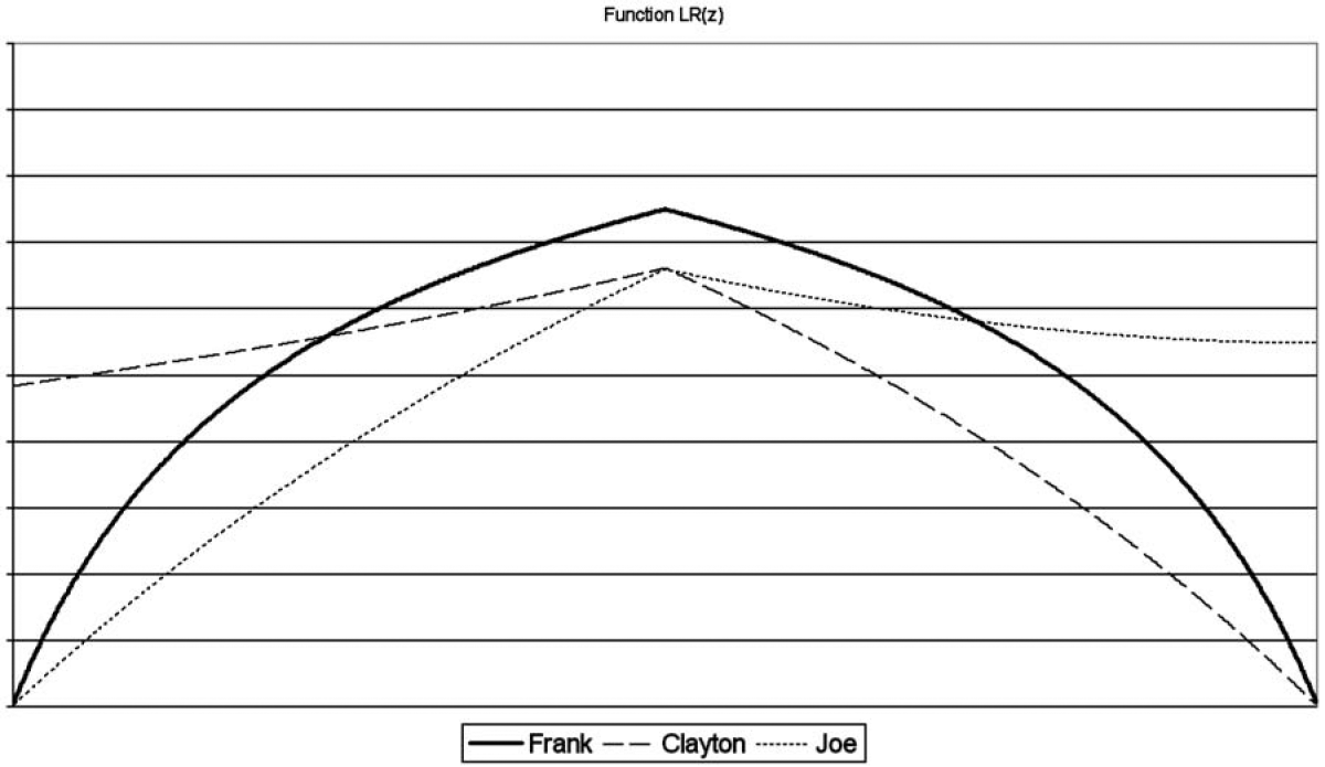where the L(z) function is the probability of U < z conditionally on V < z, while R(z) is the probability of U > z conditionally on V > z. For the three copulas studied in this paper, the Frank, the Clayton, and the Joe copulas, each LR(z) is shown in Figure 1.