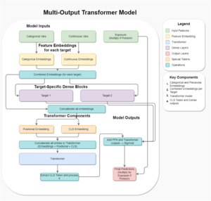 • Figure 7. Transformer architecture for multi-target insurance modeling. The model processes each target separately through embeddings, then uses self-attention to capture cross-target dependencies via a CLS token. The final prediction combines target-specific FFNs with the learned cross-target information.